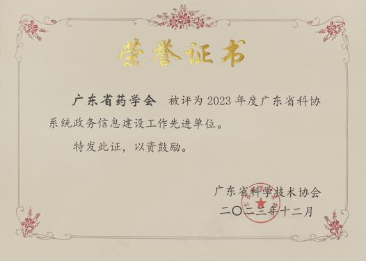 廣東省藥學(xué)會(huì)榮獲2023年度省科協(xié)系統(tǒng)政務(wù)信息建設(shè)工作先進(jìn)單位